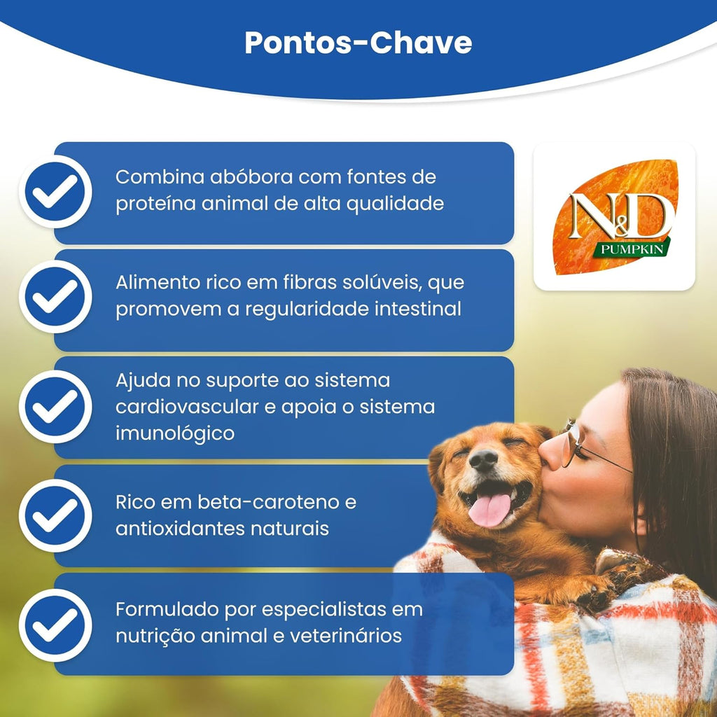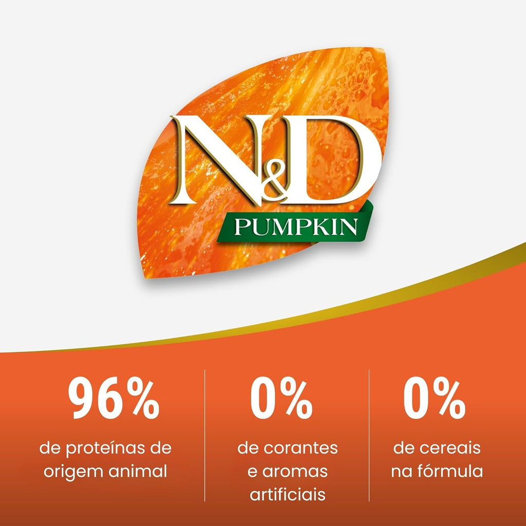Pensando no bem-estar e na saúde do seu pet a Ração N&D Pumpkin é elaborada com carnes nobres e abóbora, fontes naturais de fibras que contribuem para manter o sistema imunológico forte, além de colaborar com a saúde digestiva, urinária, prevenção do câncer, entre outros, proporcionando uma alimentação mais saudável que respeita a natureza alimentar do seu pet.