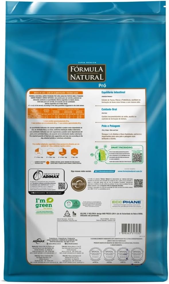 Desenvolvida por médicos-veterinários, a linha Fórmula Natural Pró oferece uma nutrição de alta qualidade para cães. Fórmula Natural Super Premium Pró Cães Adultos Portes Mini e Pequeno auxilia na saúde intestinal, contribui para uma pelagem bonita e saudável, além de promover cuidado com a saúde oral e das articulações. Disponível no sabor frango e arroz integral, oferece todos os cuidados para promover saúde, longevidade e qualidade de vida aos cães adultos. Formulada com ingredientes naturais, não contém corantes e aromatizantes artificiais.
